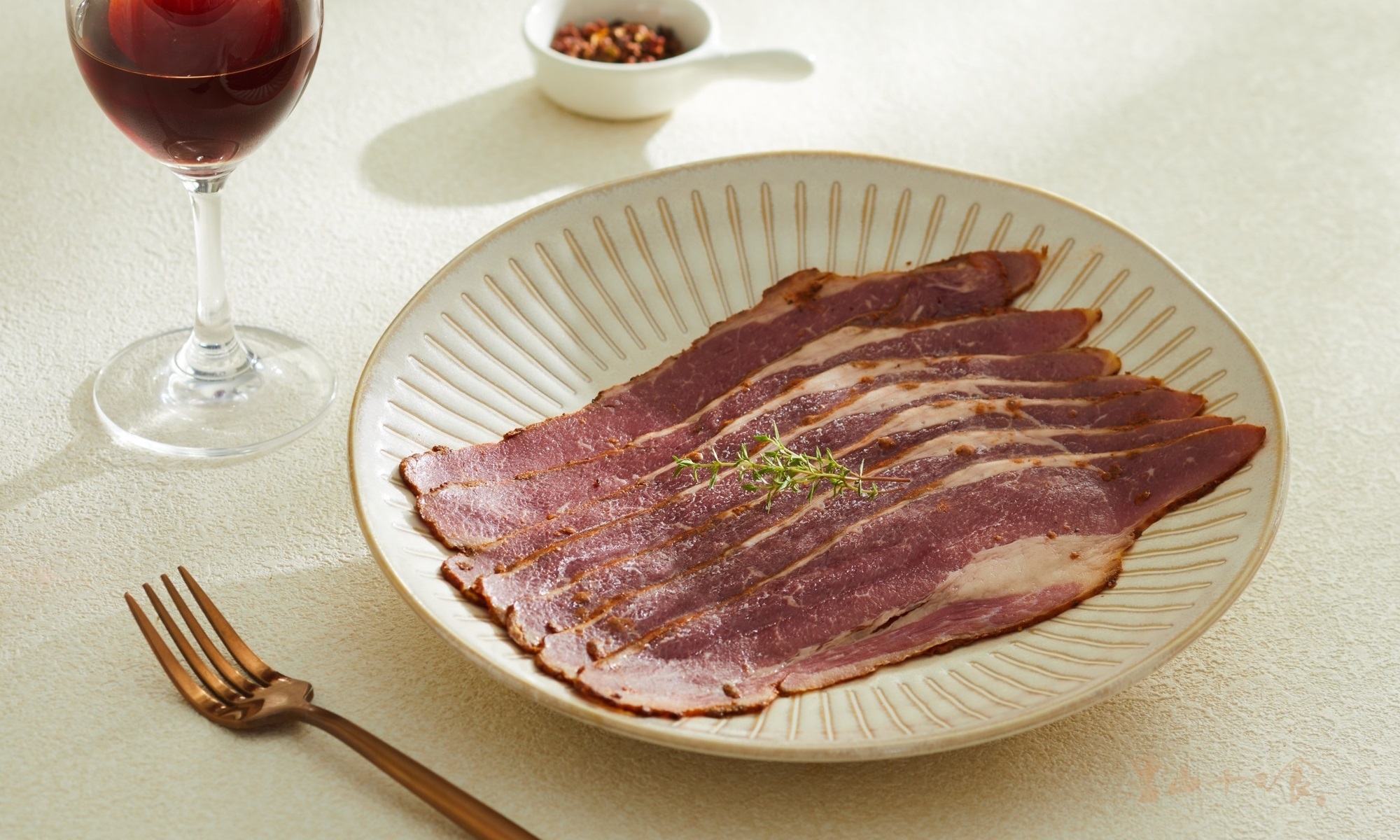 牛胸腹肉經過里山專業熟成處理後,耐心鹽醃一個月後,表面使用黃芥末粉搭配法租界燻製肉品的秘方(或有黑胡椒碎、西班牙煙燻紅椒、肉豆蔻………等),精心塗抹靜置兩天, 低溫煙燻、長時間24小時慢烤的方式,能自然軟化肉質、滲透迷人香氣。