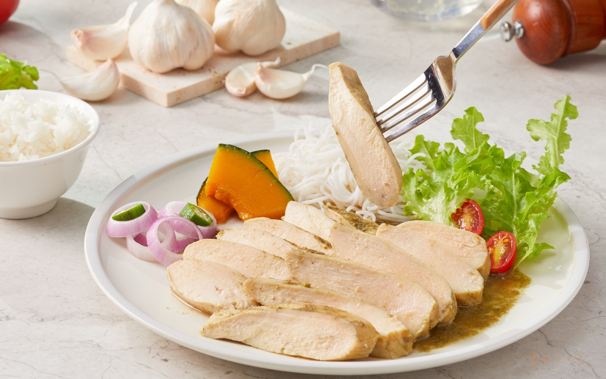 • 拆封:拆封切片後淋上真空袋內的醬汁,一道驚豔老饕味蕾的高蛋白輕食即可上桌。