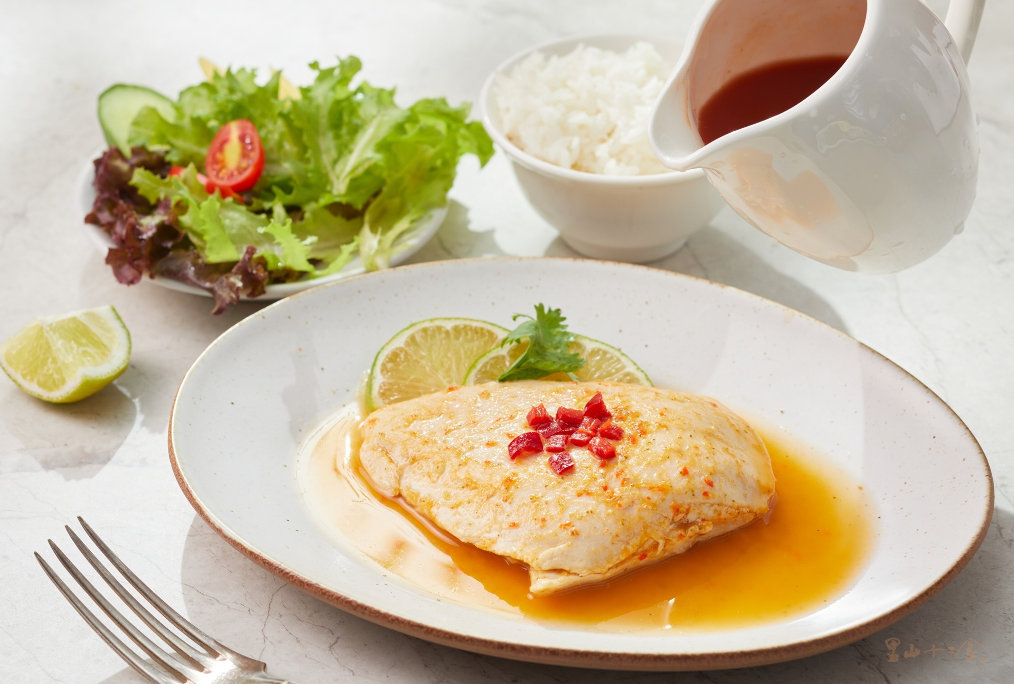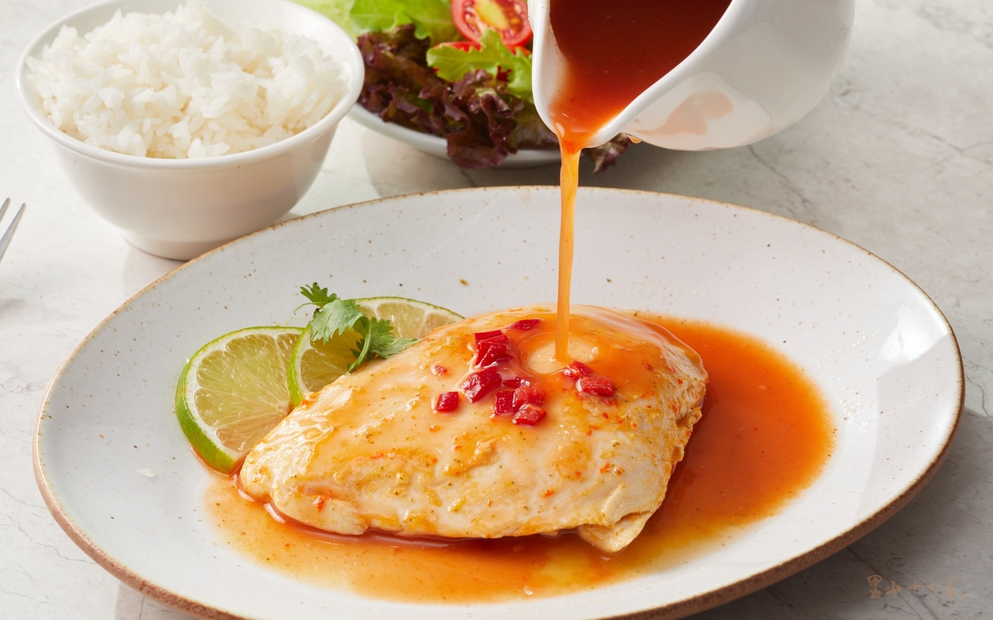 「泰式鮮嫩舒肥肥雞」,堅持無味素、無防腐劑,使用新鮮檸檬汁、鹽麴、魚露、食用醋、天然辛香料(蒜、薑、小辣椒、大紅辣椒、香菜、痲瘋柑葉)等獨家醬汁,襯托台灣鮮宰雞肉的鮮嫩、肉甜多汁。